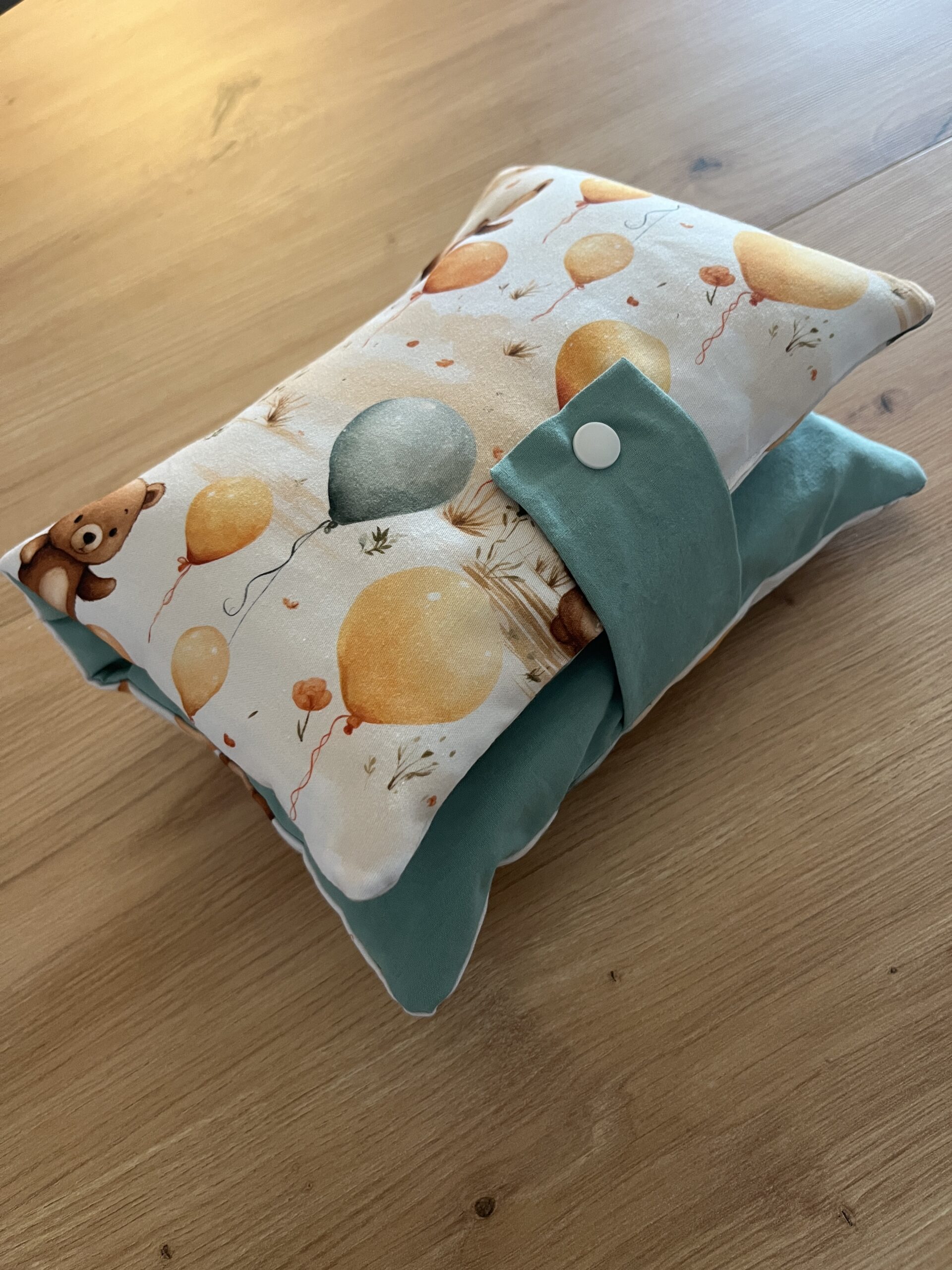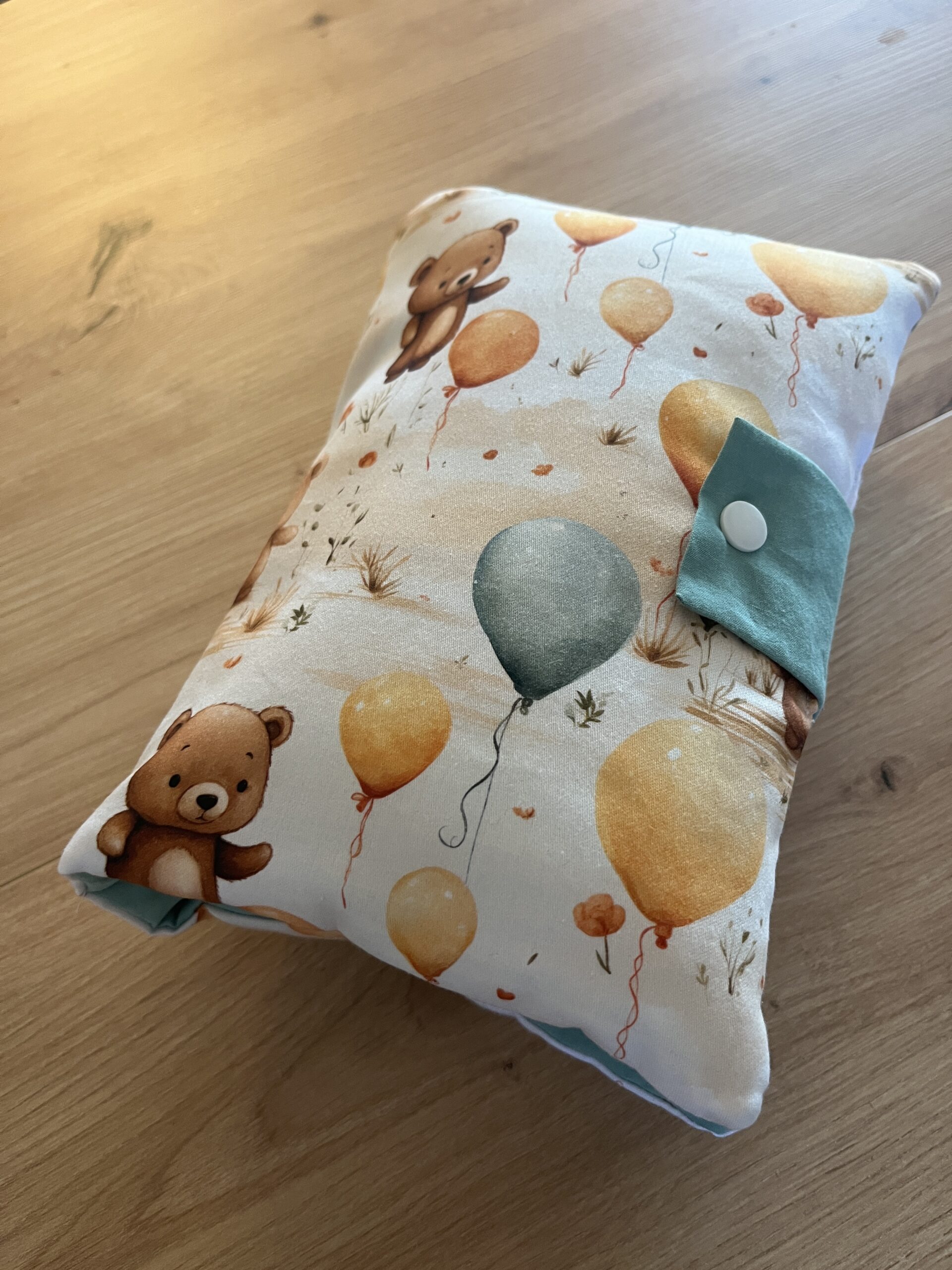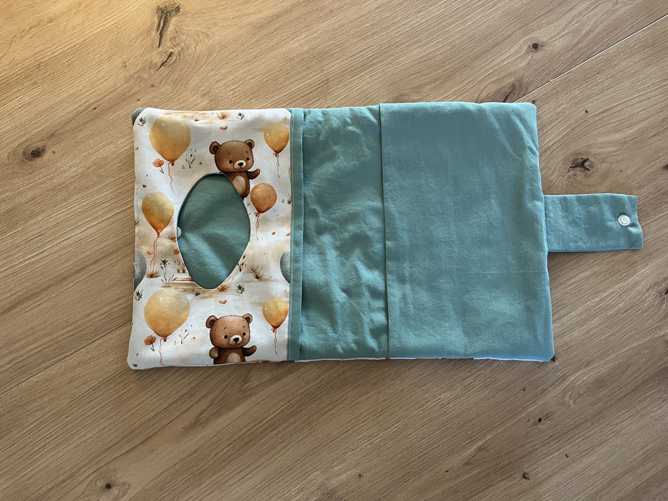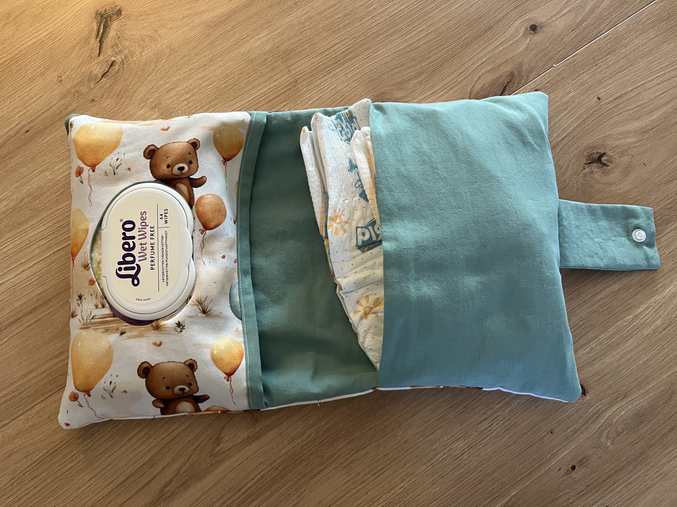 Az egyik oldalába a popkitörlő kendő a másik oldalán a zsebbe 5-6 db pelenka és szerintem a kettő közé összehajtva egy anyag pelus is kényelmesen elfér.Belseje enyhén bélelt, hogy legyen tartása. Műanyag patenttal záródik. A kéne benne elhelyezett törlő kendő és pelenka csak illusztráció, nem a termék része.