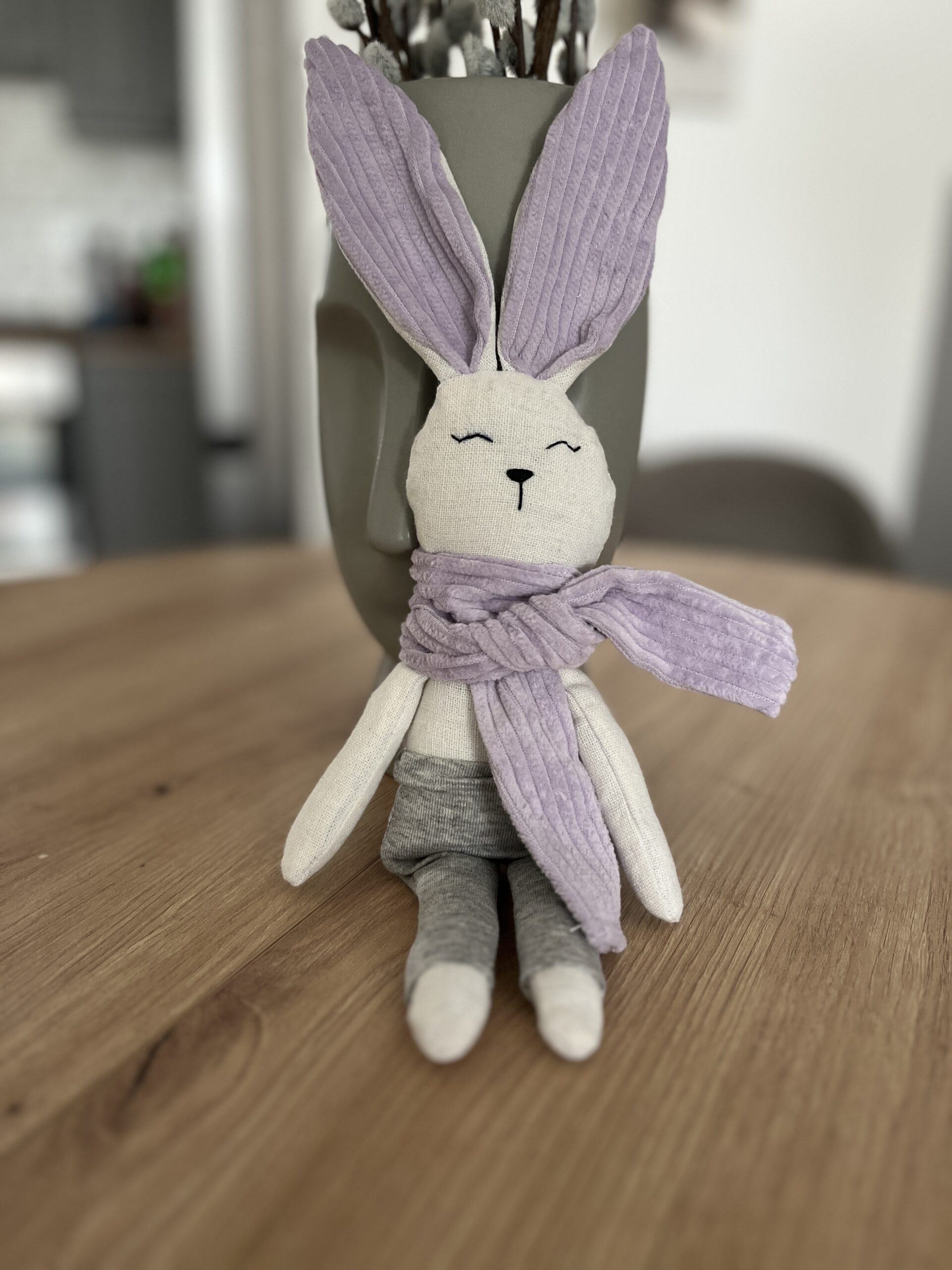 Pamut, kézzel hímzett pofival, 36 cm a lábától a füle hegyéig. 30 fokon mosható. Kézzel hímzett nevet kérhetsz a fülébe és így névre szóló lesz.